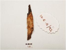| Description / विवरण | Fragment of iron nail, rough surface, broken from both ends, rusted, coroded and rectangular in section. |