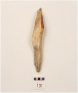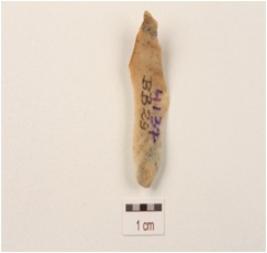 | Description / विवरण | A chert blade made on core, with three blade scars, use-wear marks on the cutting edge, broken on both the ends and trapezoidal in section. |