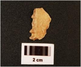 | Description / विवरण | A chert blade with denticulated edge and distal end broken, use wear marks on edge and diffused bulb on ventral. |