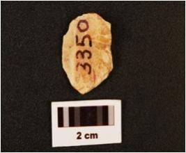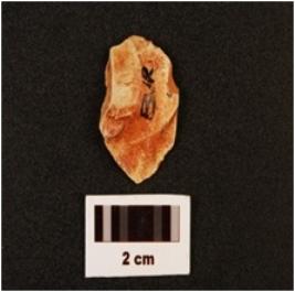 | Description / विवरण | Fragment of an unmodified chert flake with cross flake scars on the surface, prominent bulb at distal end, prepared platform. |