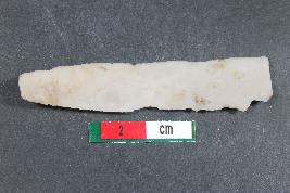 | Description / विवरण | Fragment of parallel sided blade with one dorsal ridge and positive bulb of percussion on ventral side having smooth surface. |