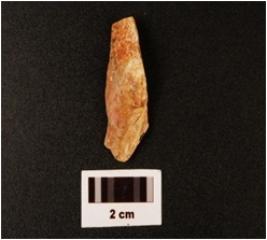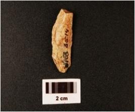 | Description / विवरण | Flake made on chert, prepared platform on the proximal end, distal end intact, irregular retouch. |