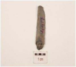 | Description / विवरण | Parallel sided chert blade, distal end broken, chipped off bulb with prepared platform, use wear marks on both working edges and mid ridge on dorsal surface. |