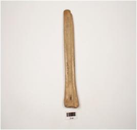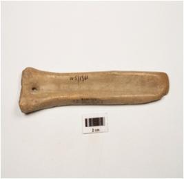 | Description / विवरण | A bone chisel with convex working end, broad thick other end with a perforation, a groove on one side, other side flat and polished surface. |