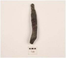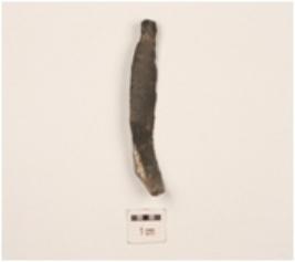 | Description / विवरण | Parallel sided chert blade, diffused bulb with striking platform, curved distal end, one blade scar on dorsal surface and use-wear marks on both working edges. |