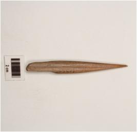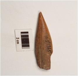 | Description / विवरण | A bone point with flat surface, tapered on one end, pointed one end partially damaged, polished brown surface, crack visible, other end partly broken and rectangular in section. |