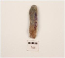 | Description / विवरण | Parallel sided chalcedony blade, prominent bulb with striking platform and use-wear marks on both working edge. |