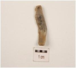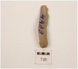 | Description / विवरण | Parallel sided chalcedony blade, bulb absent striking platform visible, curved distal end and use-wear marks on both working edge. |