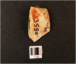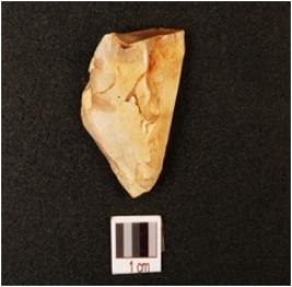 | Description / विवरण | A chert flake with three flake scars on surface and use wear marks on edges, smooth surface. |