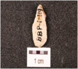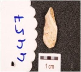 | Description / विवरण | An utilized flake made on an end struck chert, prepared platform, diffused bulb on ventral side, blade scars on dorsal side and use-wear marks along sharp edges. |