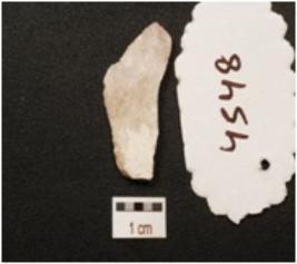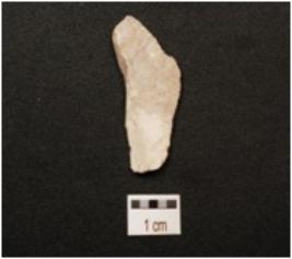 | Description / विवरण | A blade made on chert, blade scars on dorsal side, broken distal end, use wear marks along cutting edge and diffused bulb on ventral side. |
