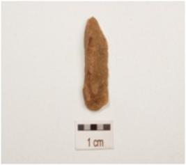 | Description / विवरण | A flake made on chert, blade scars on dorsal side, pointed distal end and use wear marks along cutting edge. |