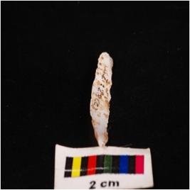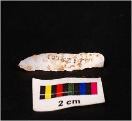 | Description / विवरण | A parallel sided blade of chalcedony with a mid-ridge on dorsal use ware marks on cutting edges and triangular in section. |