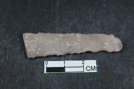 | Description / विवरण | Fragment of a slightly cruved blade with two dorsal ridges having smooth surface. |