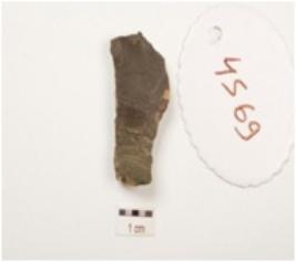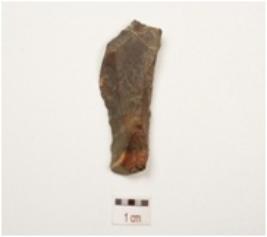 | Description / विवरण | A flake made on chert, blade scars on dorsal side, diffused bulb on ventral side, broken on distal end and use wear marks along cutting edge. |