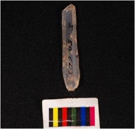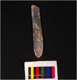 | Description / विवरण | Parallel sided blade made up of chalcedony two on ridge on dorsal surface, ventral is smooth with prominent bulb and use wear marks on edge. |