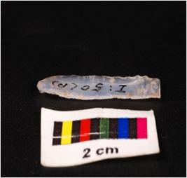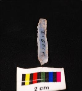 | Description / विवरण | Parallel sided blade of chalcedony with double ridge on dorsal diffused bulb on ventral and use wear marks on the cutting edges. |
