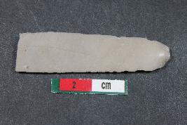 | Description / विवरण | Fragment of a Blade with two dorsal ridges having smooth surface. It also has bulb of percussion on the ventral side. |