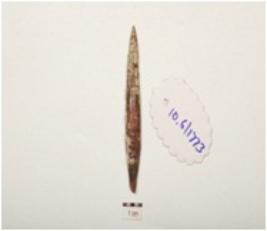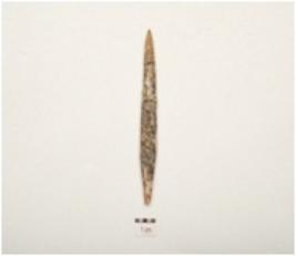 | Description / विवरण | A point made on bone with polished surface, flat broad at centre, pointed towards both ends, slightly broken at one pointed end, rectangular in section. |