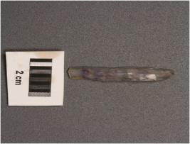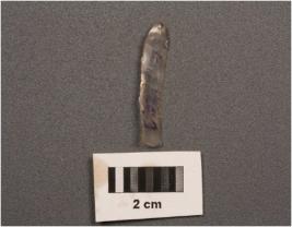 | Description / विवरण | Chalcedony blade, three ridges on dorsal, prominent bulbon proximal end. Use wear mark on edges. |