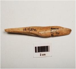 | Description / विवरण | A bone point, polished and uneven surface, one pointed end one thick end slightly broken from both ends with crack marks on surface. |