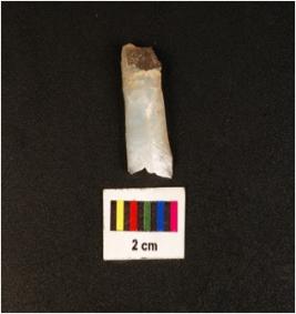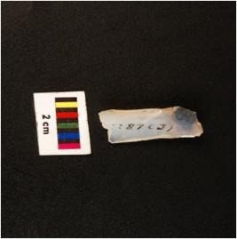 | Description / विवरण | Blade with a flake scar on dorsal, diffused bulb on ventral, working edge with use wear marks and broken distal end. |