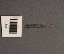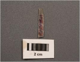 | Description / विवरण | Chalcedony blade, three ridges on dorsal, diffused bulb on proximal end, use wear mark on edges. |