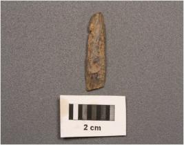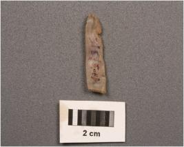| Description / विवरण | Chalcedony blade five ridges on dorsal, prominent bulb on proximal end, use wear mark on edges. |