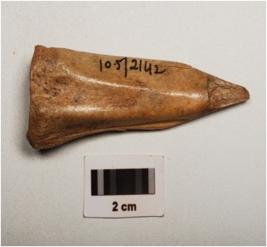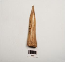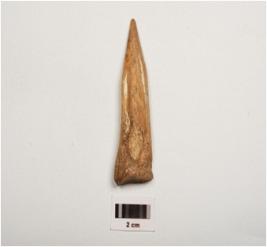 | Description / विवरण | Bone arrow head, polished surface with a partly broken pointed end, thick and broad at other end. |
