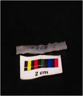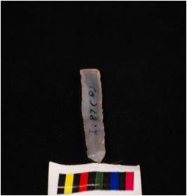 | Description / विवरण | A parallel sided blade of chalcedony with two ridge on dorsal irregular retouching on cutting edges and triangular in section. |