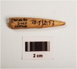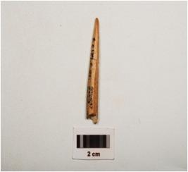 | Description / विवरण | Fragment of a bone point, partly polished surface with a pointed end, broken from other end and circular in section. |