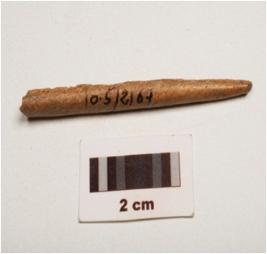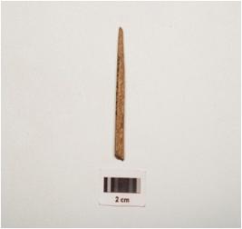 | Description / विवरण | A bone point with slightly broken pointed end, polished surface, partly broken from other end and brown in colour. |