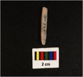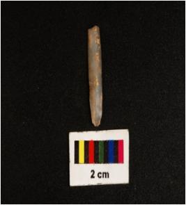 | Description / विवरण | Parallel sided microlithic blade with use wear marks on cutting edges, double ridge on dorsal and diffused bulb on ventral. |