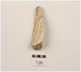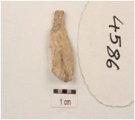| Description / विवरण | Flake made on chert with prepared platform, mid-ridge on dorsal side, bulb on ventral side use-wear marks along cutting edges and triangular in section. |