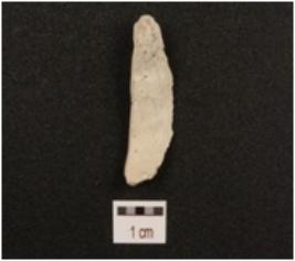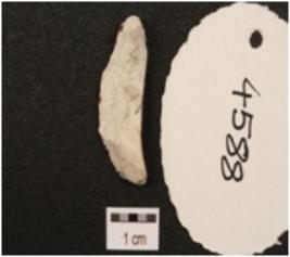 | Description / विवरण | Flake made on chert with a ridge on dorsal side, prominent bulb on ventral side and use-wear marks along cutting edges. |