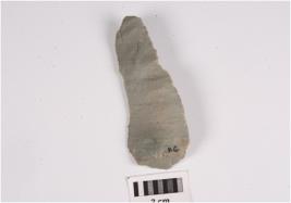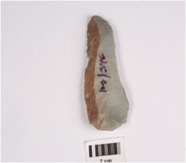 | Description / विवरण | A chert stone blade, mid ridge on dorsal surface, cortex on edge, ventral surface is smooth and prominent bulb at proximal end, use wear marks on edge. |