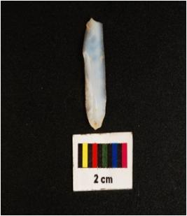 | Description / विवरण | Parallel sided microlithic blade with use wear marks on cutting edges, improminent double ridge on dorsal and diffused bulb on ventral. |