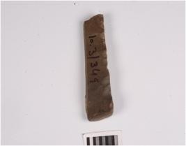 | Description / विवरण | Chert stone blade, mid ridge on dorsal surface, ventral surface is smooth and distal end is broken, use wear marks on edge. |