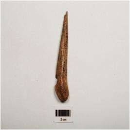 | Description / विवरण | A bone point polished surface with crack marks, one pointed and one thick end, partly broken from both ends and dark brown in colour. |