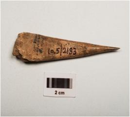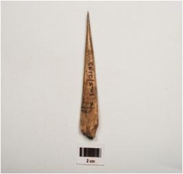 | Description / विवरण | A bone point, polished surface with a pointed end, partly broken from thick end and brown in colour. |