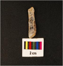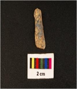 | Description / विवरण | Blade with flake scar on dorsal diffused bulb on ventral and working edges with use wear marks. |