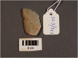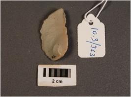| Description / विवरण | Pen knife shaped lime stone blade, ridge on dorsal side, irregular edges, diffused bulb, proximal end, pointed top. |