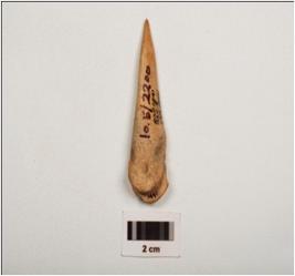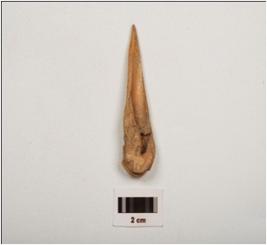 | Description / विवरण | A point made on a joint bone, polished surface with a pointed end, thick and broad at other end and light brown in colour. |