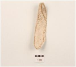 | Description / विवरण | Single sided blade made on chert with use-wear marks on cutting edge, mid-ridge on dorsal side and diffused bulb on ventral side. |