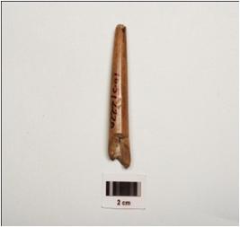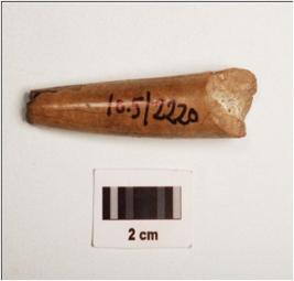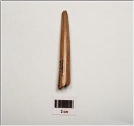 | Description / विवरण | A horn point, polished surface with vertical crack marks, partly broken from both ends and dark brown in colour. |