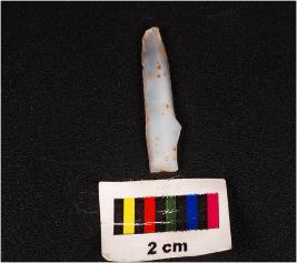 | Description / विवरण | A parallel sided blade made on chalcedony with two ridge on the dorsal prominent bulb on the ventral side, prepared platform, irregular retouch on cutting edges and trapezoidal in section. |