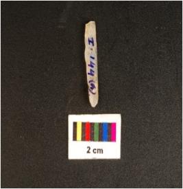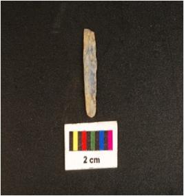 | Description / विवरण | Parallel sided microlithic blade with mid ridge on dorsal, diffused bulb on ventral, triangular in section and use wear marks on cutting edges. |