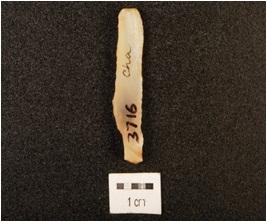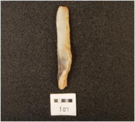| Description / विवरण | Blade on chalcedony, parallel sided, striking platform on proximal end with positive bulb on its ventral side, flake scars and blade scars on dorsal side triangular cross section. |