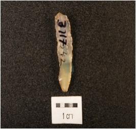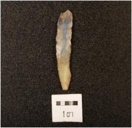 | Description / विवरण | Blade with a striking platform on proximal end, positive bulb on ventral side near striking platform, retouches on both working edges, ridge on dorsal side, distal end slightly broken, ripple marks on positive bulb and triangular cross section. |