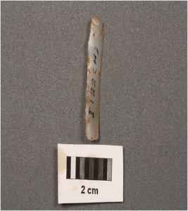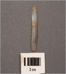 | Description / विवरण | Paralle, sided microlithic blade with use wear marks on cutting edges, ridge on dorsal surface and diffused bulb on ventral. |